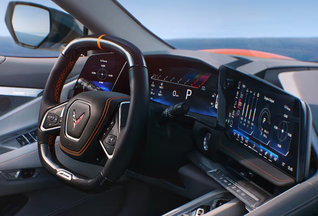 The reimagined Chevrolet Corvette Z06 interior introduces a new level of technological sophistication. Climb inside at our Waterford, MI Chevy dealership, and you'll discover a 14-inch driver information center, a 12.7-inch center touchscreen, and a 6.6-inch auxiliary touchscreen. You will also find Google™ Built-In compatibility, a wireless charging pad, wireless Apple CarPlay® and Android Auto™, a Wi-Fi® hotspot, and a 14-speaker Bose® sound system. The available performance data recorder has been enhanced and no longer requires a laptop or phone for maximum functionality.