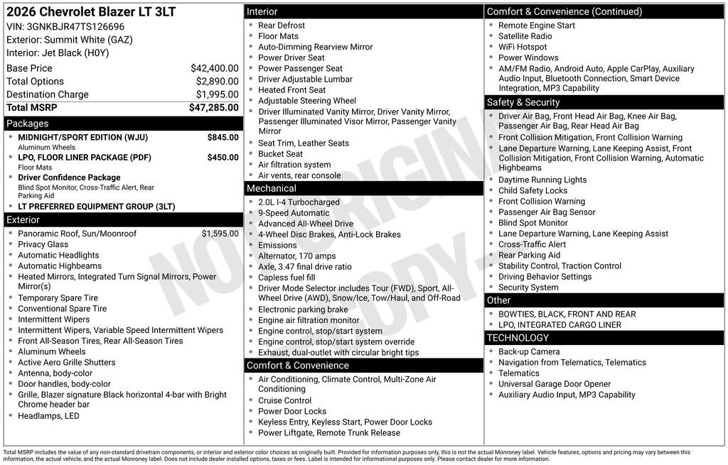 This is one impressive car. I purchased the Chevrolet Blazer with 6 cylinder engine. It has everything I want. Great acceleration, Great styling, Quiet engine, Well equiped, I really like the turn signals in the mirrors, push button start, blind spot monitoring, cross traffic monitoring, Continental Tires, and easy pairing of cell phone. I did not get AWD or GPS. There is nothing, I would change and for the price, a great deal to boot. You won't be disappointed. - 5.0