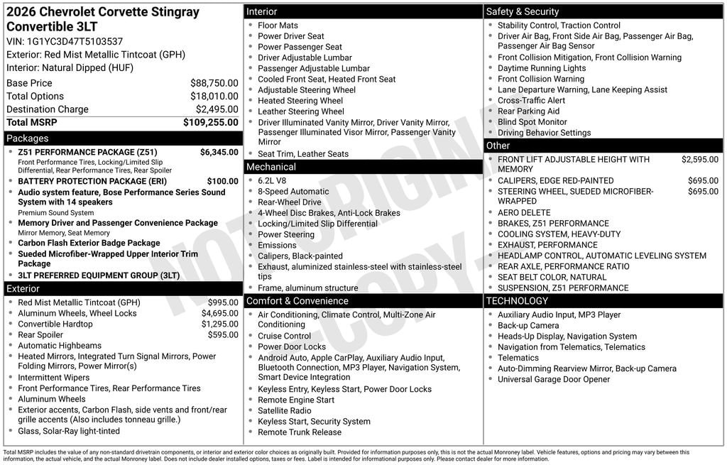 Crafted with the discerning driver in mind, this 2026 Chevrolet Corvette Stingray 3LT is a testament to the brand's commitment to excellence. With its uncompromising performance, stunning design, and comprehensive suite of premium features, this Corvette is poised to exceed your expectations and deliver an unparalleled driving experience.