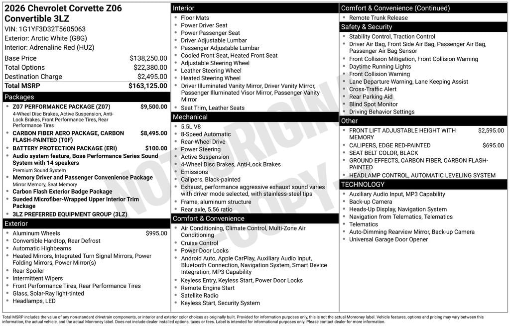 Recent Arrival!Arctic White 2026 Chevrolet Corvette Z06 3LZ RWD 8-Speed Dual Clutch 5.5L V8Must qualify for GM Employee discount, others will be slightly higher. Tax, title, license and dealer fees (unless itemized above) are extra. Not available with special finance or lease offers. Price Can include additional rebates.Joe Lunghamer Chevrolet has been family-owned and proudly serving Oakland County and surrounding communities since 1954. Our mission is simple: deliver exceptional customer service and a total ownership experience that feels effortless. Thatâs how weâve earned customer loyalty for more than 70 years. We invite you to visit our dealership, explore our large selection of new and used vehicles, and meet our knowledgeable sales and service teams. At Joe Lunghamer Chevrolet, weâre here to serve you.