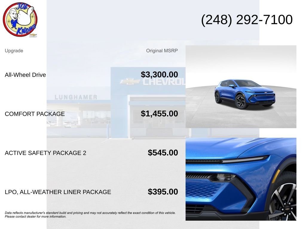 $6,623 off MSRP! Priced below KBB Fair Purchase Price!Riptide Blue Metallic 2026 Chevrolet Equinox EV LT AWD 1-Speed Automatic Electric MotorMust qualify for GM Employee discount, others will be slightly higher. Tax, title, license and dealer fees (unless itemized above) are extra. Not available with special finance or lease offers. Price Can include additional rebates.Joe Lunghamer Chevrolet has been family-owned and proudly serving Oakland County and surrounding communities since 1954. Our mission is simple: deliver exceptional customer service and a total ownership experience that feels effortless. Thatâs how weâve earned customer loyalty for more than 70 years. We invite you to visit our dealership, explore our large selection of new and used vehicles, and meet our knowledgeable sales and service teams. At Joe Lunghamer Chevrolet, weâre here to serve you. . Must qualify for GM Employee discount, others will be slightly higher. Tax, title, license and dealer fees (unless itemized above) are extra. Not available with special finance or lease offers. Price includes: $6500 - Chevrolet Consumer Cash Program. Exp. 04/30/2026