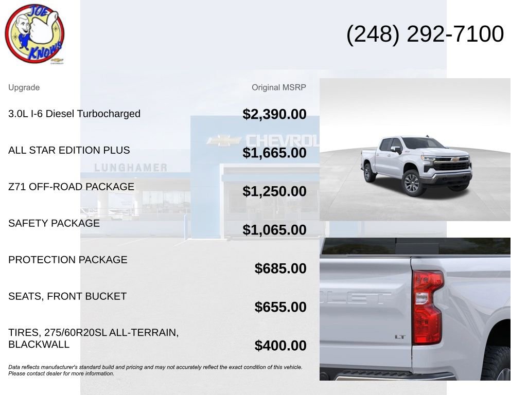 The All Star Edition Plus package elevates your driving experience with premium features like 20-inch aluminum wheels, a convenient Convenience Package II, and the off-road-ready Z71 suspension. The Safety Package ensures your peace of mind with advanced driver-assist technologies, including HD Surround Vision, Rear Cross Traffic Braking, and Trailer Side Blind Zone Alert.