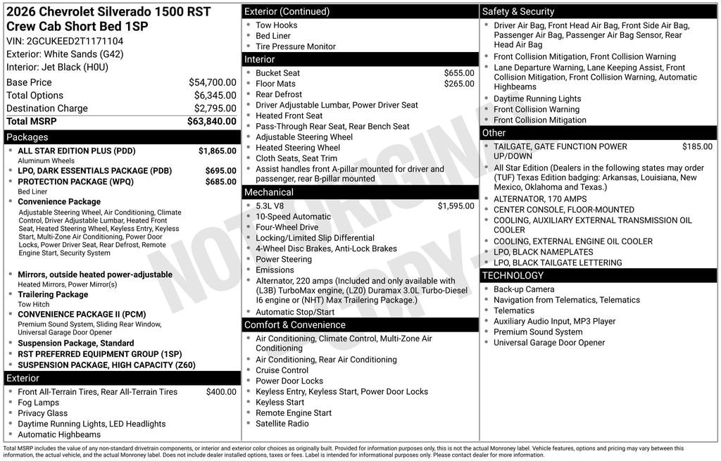 The 2026 Chevrolet Silverado 1500 RST is available now at our dealership for $53,083. We're confident this exceptional truck will exceed your expectations. Visit us today to take a closer look and see how the Silverado RST can enhance your driving experience. . Must qualify for GM Employee discount, others will be slightly higher. Tax, title, license and dealer fees (unless itemized above) are extra. Not available with special finance or lease offers. Price includes: $1250 - GM Costco Executive Member Private Offer . Exp. 04/30/2026 $4250 - Chevrolet Consumer Cash Program. Exp. 04/30/2026 $500 - Chevrolet Bonus Cash. Exp. 04/30/2026