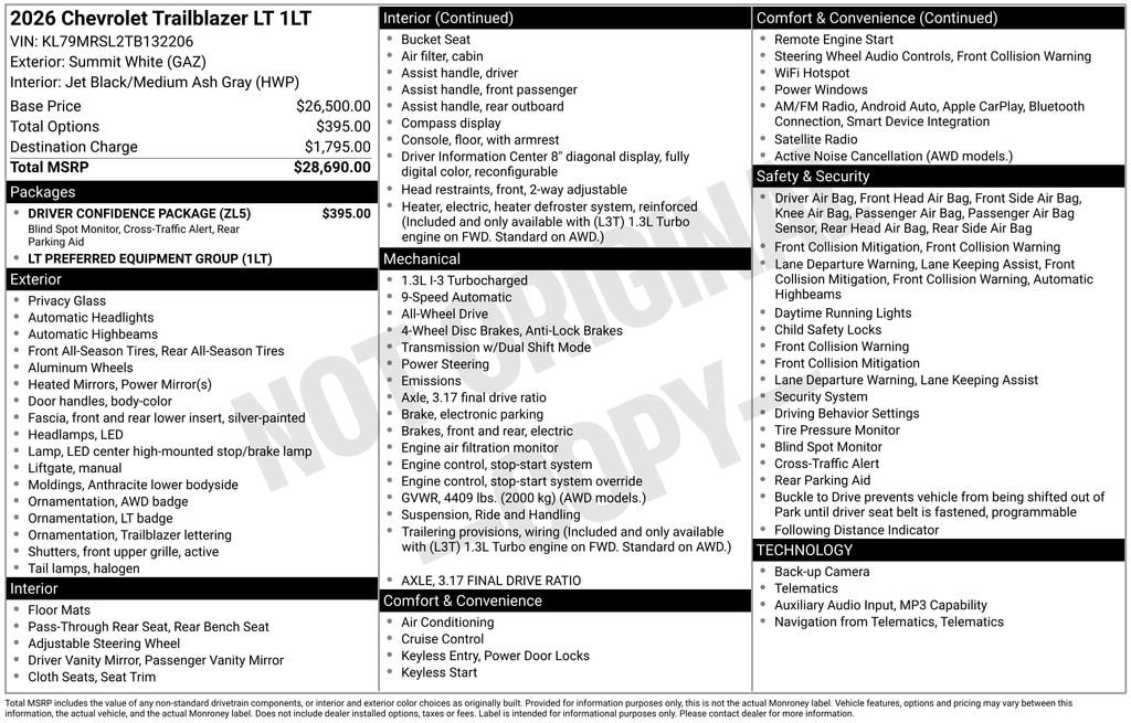 Summit White 2026 Chevrolet TrailBlazer LT AWD 9-Speed Automatic 1.3L I3 Turbocharged DOHC 12V LEV3-SULEV30 155hp