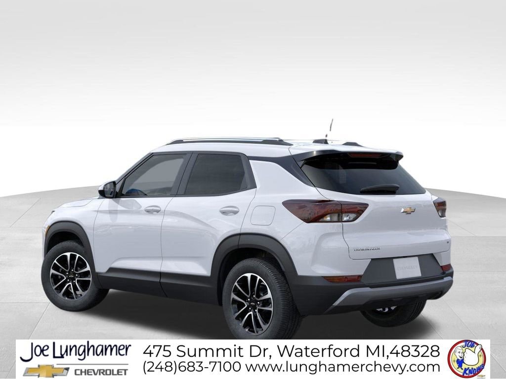 The exterior of the TrailBlazer LT is adorned in a sleek White color, complemented by 17 high-gloss black machined aluminum wheels that lend a stylish and modern appearance. The body-color bumpers and power door mirrors add to the vehicle's refined aesthetic, while the rear window wiper and variably intermittent wipers provide enhanced visibility in inclement weather.