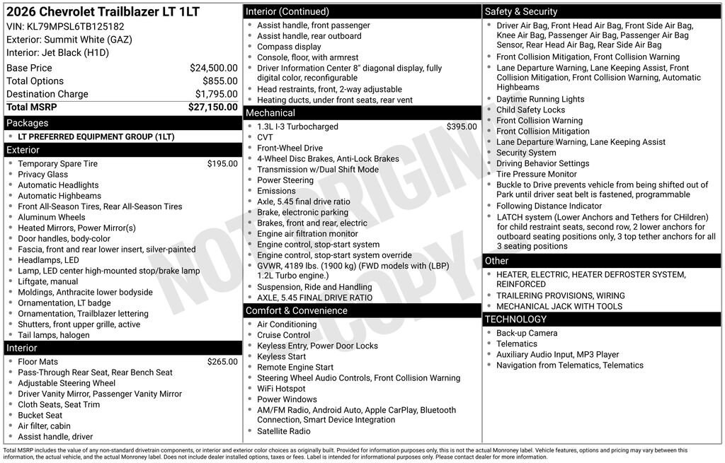 With its impressive combination of performance, technology, and safety features, the 2026 Chevrolet TrailBlazer LT is a compelling choice for those seeking a capable and stylish compact SUV. Experience the difference for yourself by scheduling a test drive at our dealership today. . Must qualify for GM Employee discount, others will be slightly higher. Tax, title, license and dealer fees (unless itemized above) are extra. Not available with special finance or lease offers. Price includes: $500 - GM Financial Standalone Special APR & Down Payment Assistance Program: $500 discount and 15.90% APR for 36 months. $35.11 per $1000 financed. Available to well qualified buyers who finance through GM Financial. XGU. Exp. 03/31/2026