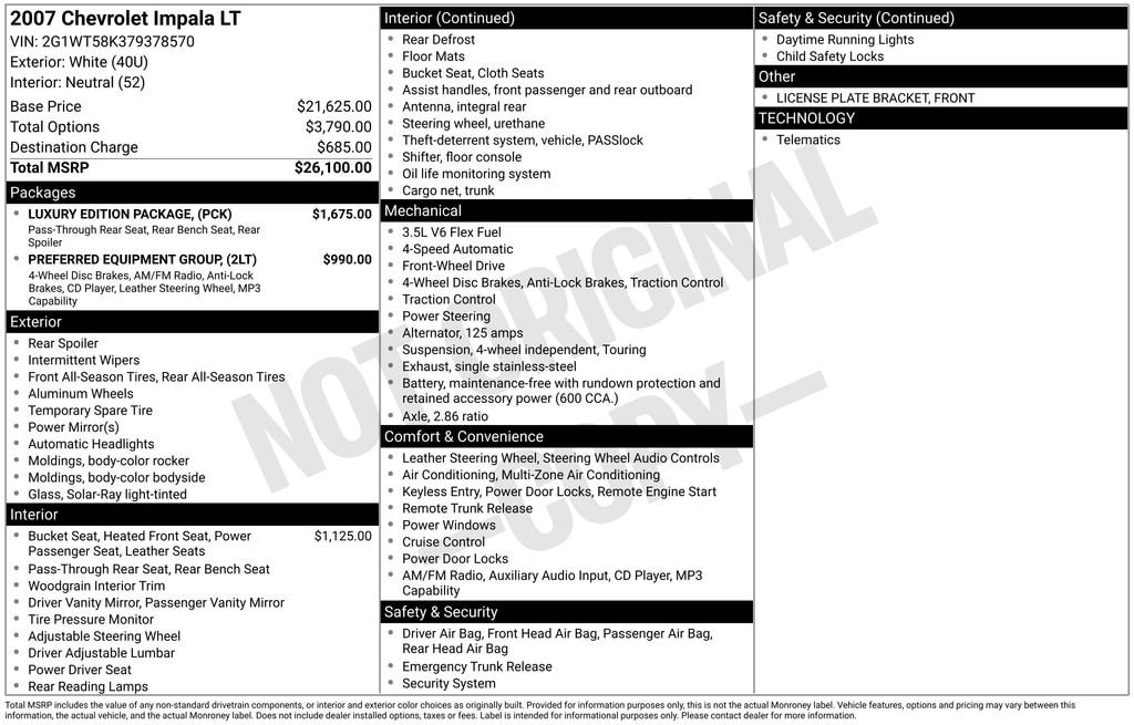 Whether commuting, running errands, or embarking on a road trip, this 2007 Chevrolet Impala LT is a refined and capable companion. With its impressive list of features, efficient powertrain, and well-appointed interior, this Impala is sure to exceed your expectations. We invite you to experience this exceptional sedan firsthand at our showroom.