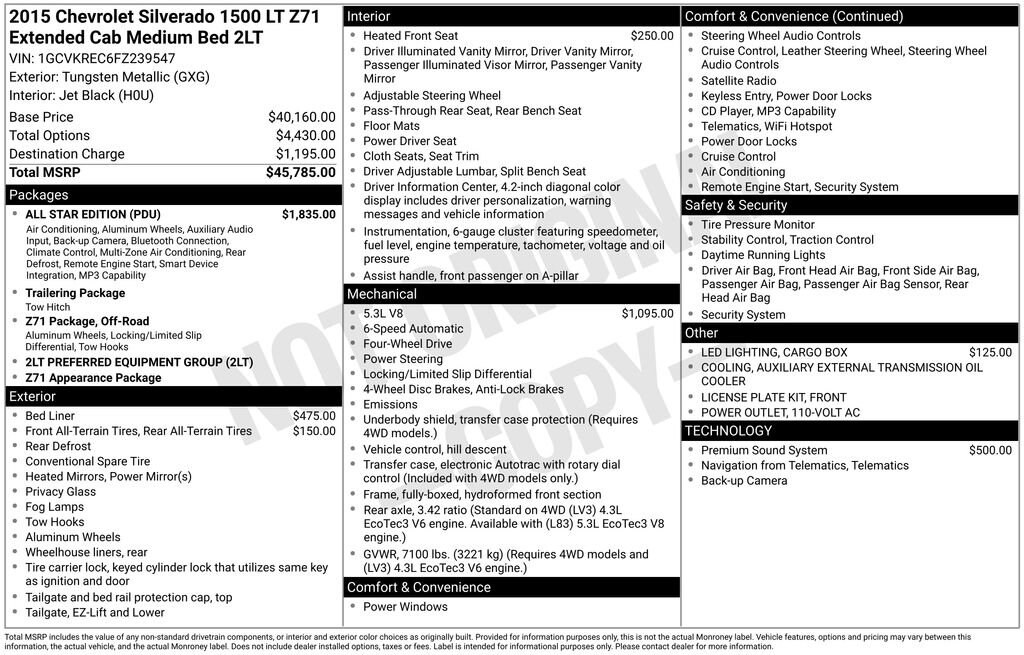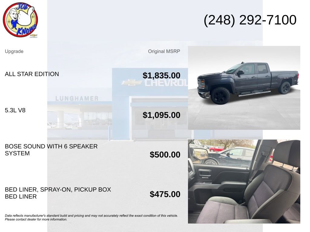 Elevate your driving experience with this stunning 2015 Chevrolet Silverado 1500 LT LT2. Boasting a powerful EcoTec3 5.3L V8 engine, this truck delivers exceptional performance and efficiency, with an impressive 16 city/22 highway MPG rating. Adorned in a handsome Gray exterior, this Silverado LT LT2 is more than just a workhorse it's a true head-turner.- Spray-On Pickup Box Bed Liner with Bowtie Logo- Heated Driver and Front Passenger Seating- All Star Edition with Premium Features- Bose Sound System with 6 Speakers- Dual-Zone Automatic Climate Control- Remote Vehicle Starter System- Rear Vision Camera with Dynamic Guide Lines- 110-Volt AC Power OutletThis Silverado LT LT2 is meticulously equipped to elevate your driving experience. The Spray-On Pickup Box Bed Liner provides unparalleled protection and durability, while the Heated Driver and Front Passenger Seating ensures your comfort in any weather. The All Star Edition further enhances the experience with premium features like the Bose Sound System, Dual-Zone Automatic Climate Control, and Remote Vehicle Starter System.Designed with your needs in mind, the Silverado LT LT2 offers a wealth of practical and convenient features. The Rear Vision Camera with Dynamic Guide Lines simplifies maneuvering and parking, while the 110-Volt AC Power Outlet allows you to power your devices on the go. With its impressive combination of capability, comfort, and technology, this Silverado LT LT2 is the perfect companion for your adventures.Experience the power and refinement of this 2015 Chevrolet Silverado 1500 LT LT2. Meticulously maintained and ready to take on any task, this truck is a true gem in the Silverado lineup. We invite you to visit our showroom and take this remarkable vehicle for a test drive. Discover the difference that the Silverado LT LT2 can make in your daily life and let it elevate your driving experience to new heights.