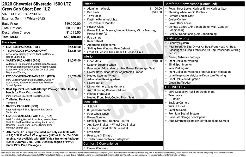 Discover the ultimate in capability, technology, and comfort with this stunning 2020 Chevrolet Silverado 1500 LTZ. This powerful truck is built to handle any task with ease, whether you're hauling heavy loads, navigating rough terrain, or enjoying a smooth, refined ride.
