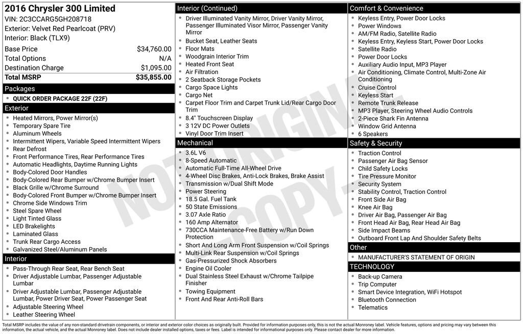 Discover the perfect blend of style, performance, and technology in the 2016 Chrysler 300 Limited. This stunning sedan is a true standout, designed to elevate your driving experience and exceed your expectations.Boasting a sleek, sophisticated exterior in a striking Red finish, the 300 Limited commands attention wherever it goes. Under the hood, a powerful 3.6L V6 24V VVT engine, paired with an 8-Speed Automatic transmission and All-Wheel Drive, delivers an exhilarating ride with an impressive 27 MPG on the highway.- Quick Order Package 22F- 2-Piece Shark Fin Antenna- Uconnect 8.4 Touchscreen Display- Integrated Voice Command with Bluetooth- Heated Front Seats- Power Driver/Passenger Seats with 4-Way Lumbar Adjust- Leather-Trimmed Bucket Seats- 19 Polished Aluminum WheelsThis 300 Limited is meticulously equipped to elevate your driving experience. Enjoy the convenience of dual-zone automatic climate control, the security of a comprehensive safety suite, and the connectivity of the Uconnect infotainment system. Whether you're commuting or embarking on a road trip, the 300 Limited will keep you comfortable, connected, and in command.At our dealership, we take pride in offering an exceptional selection of vehicles and a customer-centric approach. Our knowledgeable team is here to guide you through the buying process and ensure you drive away in the perfect vehicle to suit your needs and lifestyle.We invite you to experience the exceptional craftsmanship and refined capabilities of the 2016 Chrysler 300 Limited. Schedule a test drive today and discover the difference that this remarkable sedan can make in your daily driving. We look forward to the opportunity to earn your business and help you find the perfect vehicle.