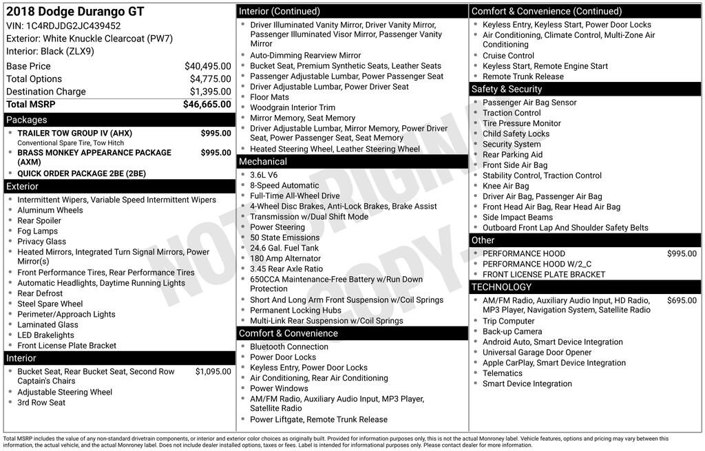 Discover the ultimate family-friendly SUV in this 2018 Dodge Durango GT. With its powerful 3.6L V6 engine, advanced all-wheel-drive system, and impressive towing capacity, this Durango is ready to take on any adventure. Boasting a sleek Brass Monkey Appearance Package, this Durango GT stands out from the crowd with its bold, blacked-out grille, badges, and 20-inch wheels.