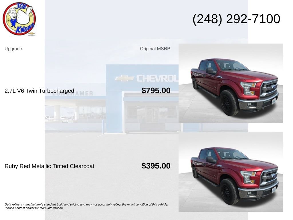 Clean CARFAX.Recent Arrival!Ruby Red Metallic 2016 Ford F-150 XLT 4WD 6-Speed Automatic Electronic 2.7L V6 EcoBoost4WD.Joe Lunghamer Chevrolet has been family-owned and proudly serving Oakland County and surrounding communities since 1954. Our mission is simple: deliver exceptional customer service and a total ownership experience that feels effortless. Whether youâre shopping for a new or pre-owned vehicle, our team is committed to finding the right fit for your lifestyle and the right financing for your budget. And when it comes to maintaining your vehicle, Joe Knows service never fits neatly into a busy schedule. Thatâs why we offer convenient service hours Monday-Friday, 8am5pm. Our service department features highly trained advisors, factory-certified technicians, and state-of-the-art equipment ensuring your vehicle is repaired right the first time at a fair price. Thatâs how weâve earned customer loyalty for more than 70 years. We invite you to visit our dealership, explore our large selection of new and used vehicles, and meet our knowledgeable sales and service teams. At Joe Lunghamer Chevrolet, weâre here to serve you.Joe knows used cars and has been family-owned and proudly serving Oakland County and surrounding communities since 1954. Our mission is simple: deliver exceptional customer service and a total ownership experience that feels effortless. Whether youâre shopping for a new or pre-owned vehicle, our team is committed to finding the right fit for your lifestyle and the right financing for your budget. And when it comes to maintaining your vehicle, Joe Knows service never fits neatly into a busy schedule. Thatâs why we offer convenient service hours Monday-Friday, 8am5pm. Our service department features highly trained advisors, factory-certified technicians, and state-of-the-art equipment ensuring your vehicle is repaired right the first time at a fair price. Thatâs how weâve earned customer loyalty for more than 70 years. We invite you to visit our dealership, explore our large selection of new and used vehicles, and meet our knowledgeable sales and service teams. At Joe Lunghamer Chevrolet, weâre here to serve you.