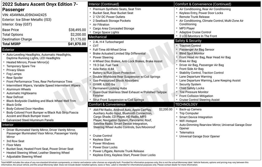 Whether you're embarking on a family road trip, navigating the daily commute, or tackling your weekend adventures, the 2022 Subaru Ascent Onyx Edition is the perfect companion. Experience the perfect balance of capability, technology, and style that this exceptional SUV has to offer.