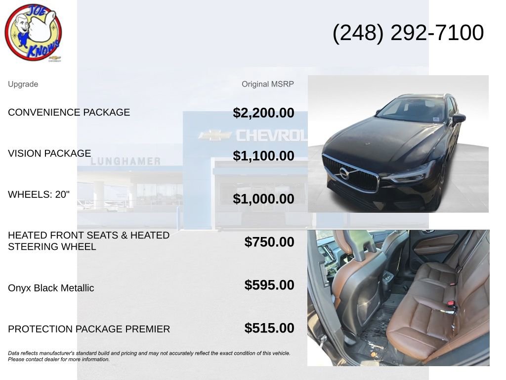 Clean CARFAX.Recent Arrival! 22/28 City/Highway MPGOnyx Black Metallic 2018 Volvo XC60 T5 Momentum AWD Automatic with Geartronic I4AWD.Joe Lunghamer Chevrolet has been family-owned and proudly serving Oakland County and surrounding communities since 1954. Our mission is simple: deliver exceptional customer service and a total ownership experience that feels effortless. Whether youâre shopping for a new or pre-owned vehicle, our team is committed to finding the right fit for your lifestyle and the right financing for your budget. And when it comes to maintaining your vehicle, Joe Knows service never fits neatly into a busy schedule. Thatâs why we offer convenient service hours Monday-Friday, 8am5pm. Our service department features highly trained advisors, factory-certified technicians, and state-of-the-art equipment ensuring your vehicle is repaired right the first time at a fair price. Thatâs how weâve earned customer loyalty for more than 70 years. We invite you to visit our dealership, explore our large selection of new and used vehicles, and meet our knowledgeable sales and service teams. At Joe Lunghamer Chevrolet, weâre here to serve you.Joe knows used cars and has been family-owned and proudly serving Oakland County and surrounding communities since 1954. Our mission is simple: deliver exceptional customer service and a total ownership experience that feels effortless. Whether youâre shopping for a new or pre-owned vehicle, our team is committed to finding the right fit for your lifestyle and the right financing for your budget. And when it comes to maintaining your vehicle, Joe Knows service never fits neatly into a busy schedule. Thatâs why we offer convenient service hours Monday-Friday, 8am5pm. Our service department features highly trained advisors, factory-certified technicians, and state-of-the-art equipment ensuring your vehicle is repaired right the first time at a fair price. Thatâs how weâve earned customer loyalty for more than 70 years. We invite you to visit our dealership, explore our large selection of new and used vehicles, and meet our knowledgeable sales and service teams. At Joe Lunghamer Chevrolet, weâre here to serve you.
